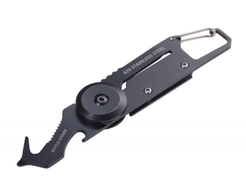 wielofunkcyjne mini narzędzie posiada 5 funkcji: nóż do otwierania paczek, karabińczyk, mały brzeszczot, śrubokręt płaski, otwieracz do butelek wykonane ze stali nierdzewnej 420 i aluminium wymiary: 86×25×10mm waga: 51g kolor: czarno-tytanowy