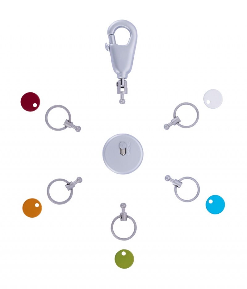w zestawie z karabińczykiem, 5 wymiennymi kółkami, kolorowymi znacznikami do rozróżniania kluczy