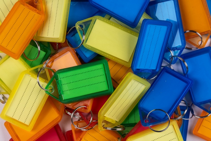 wyposażone w etykietkę opisową oraz kółeczko o średnicy 15mm łączące zawieszkę z kluczem