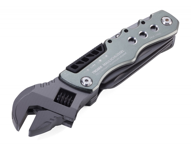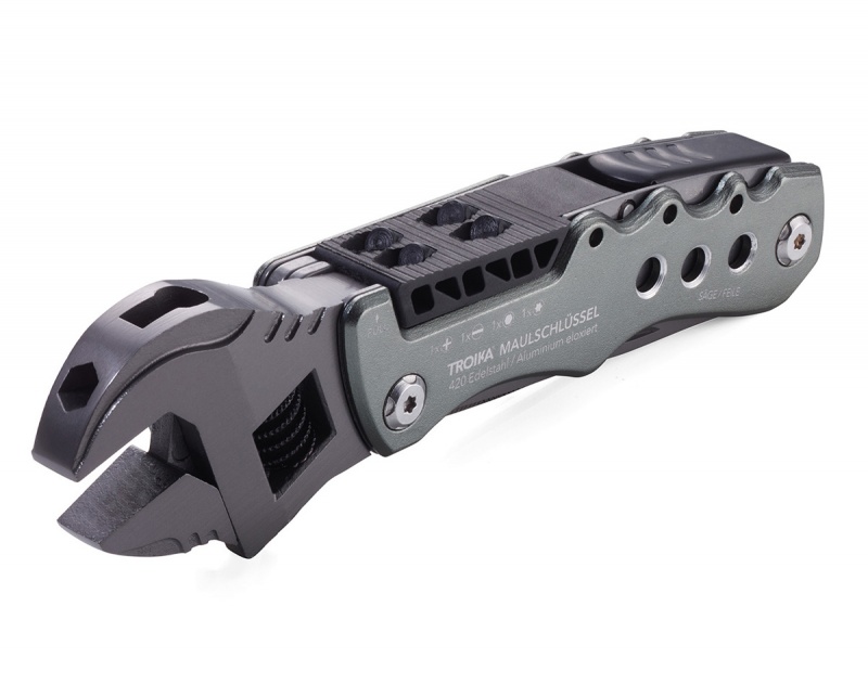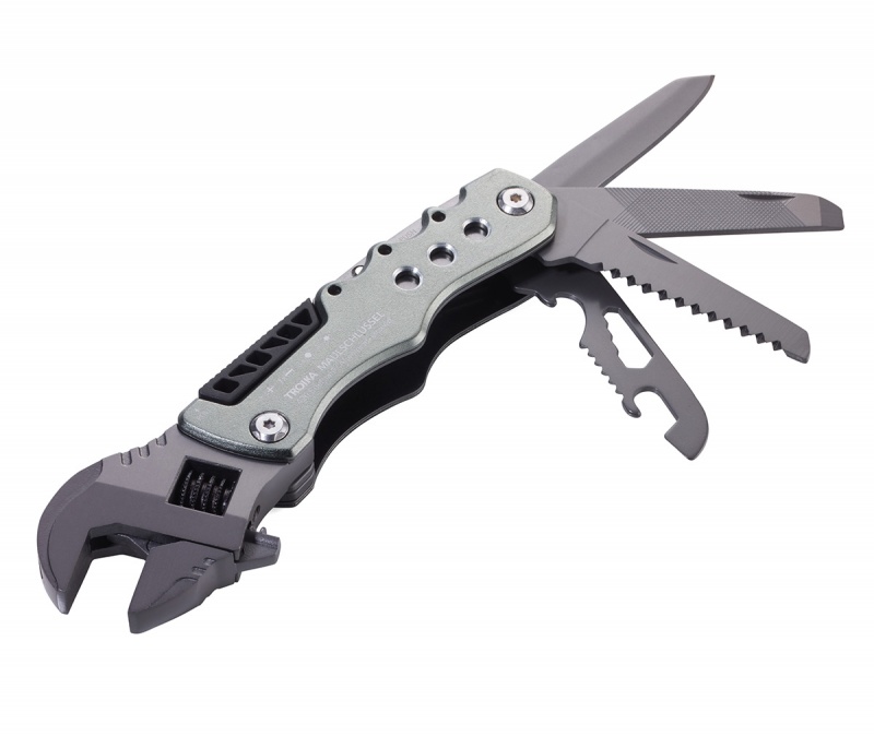 12 funkcji: klucz nastawny (angielski), nóż, piła, pilnik, otwieracz do butelek, otwieracz do puszek, szeroki śrubokręt płaski, klucz sześciokątny (4 rozmiary), 4 końcówki do narzędzia (płaska, krzyżakowa, nasadowa, sześciokątna)