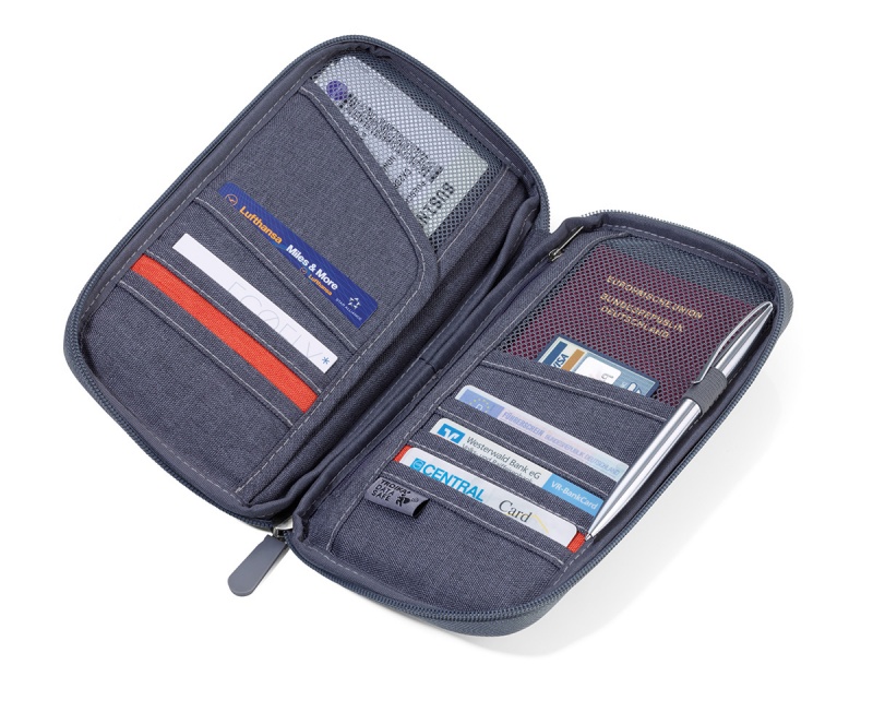 wyposażone jest w 12 przegródek wewnętrznych, które pomieszczą paszporty, bilety, karty pokładowe czy karty płatnicze